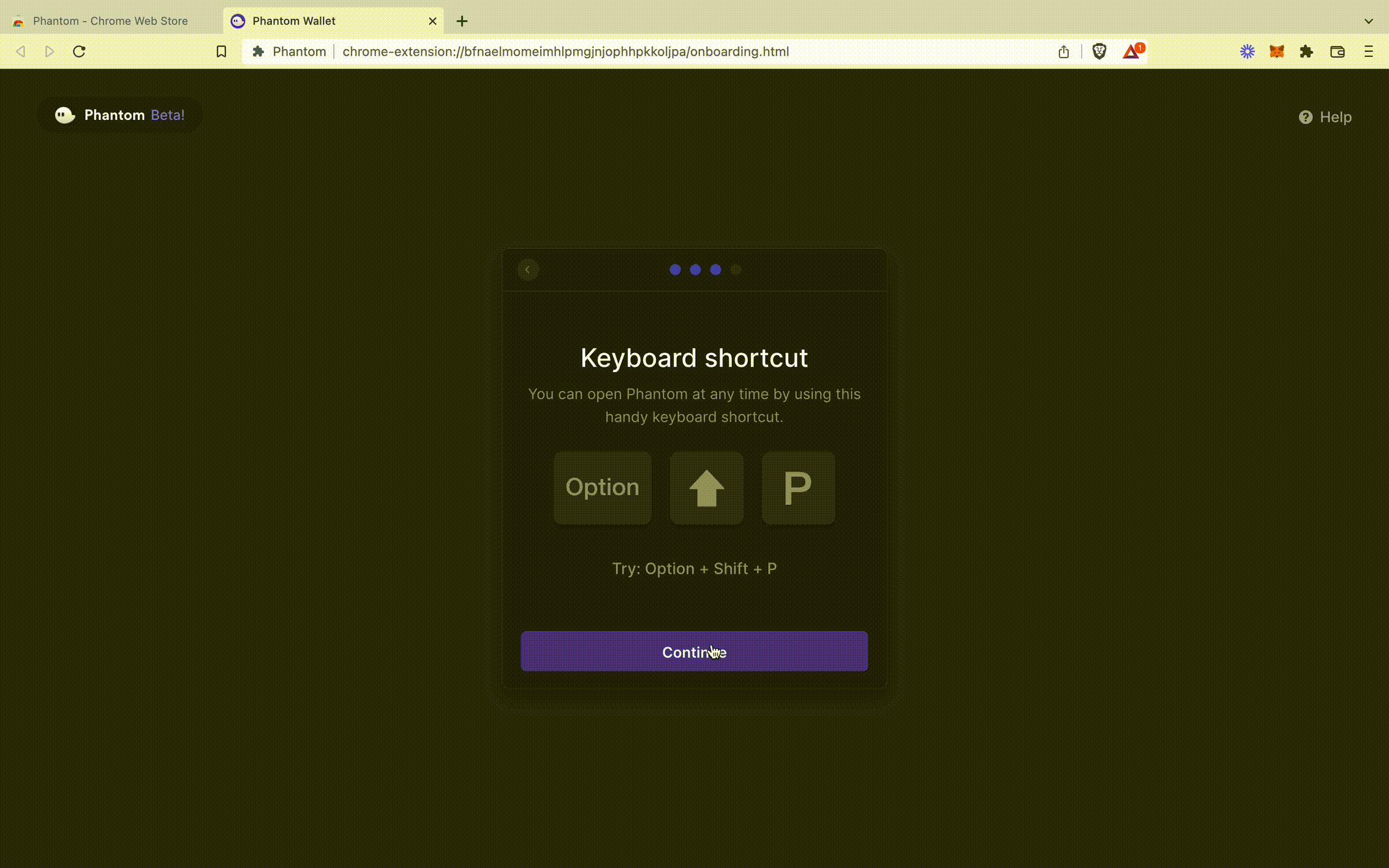 You’re all set! Pin your wallet to your browser by selecting the puzzle icon. For easy access to your wallet, you can use the keyboard shortcut “option + shift + P.”