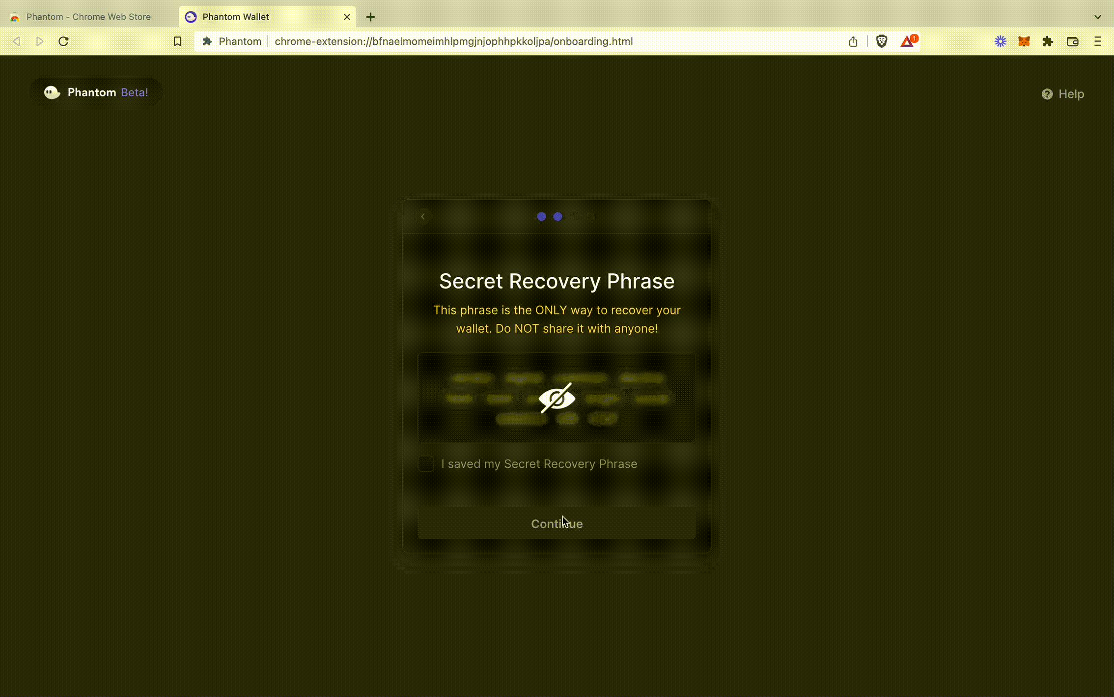 Hover your mouse over the blurred box to view your secret recovery phrase. Write down these words on a piece of paper and double-check that what you’ve written is correct. NEVER store these words electronically.